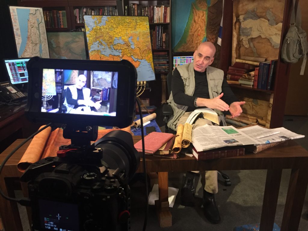 However… with only a couple of days till our flight was scheduled to depart, the Israeli government imposed a mandatory 14 day quarantine for all people coming into the country. That firmly closed the door on any production in Israel for the near future, but (LORD willing) we are making plans to return to Israel this fall and begin production on the series on the Apostle Peter. But what to do in the meantime? We prayed about it (always a good idea) and remembered we have been talking about doing a series on prophecy for a while now. With the scary situation brought about by Covid-19, we thought now the time was right to create a series that looks toward the future. Here is a photo of the set we put together in one of our office rooms:
